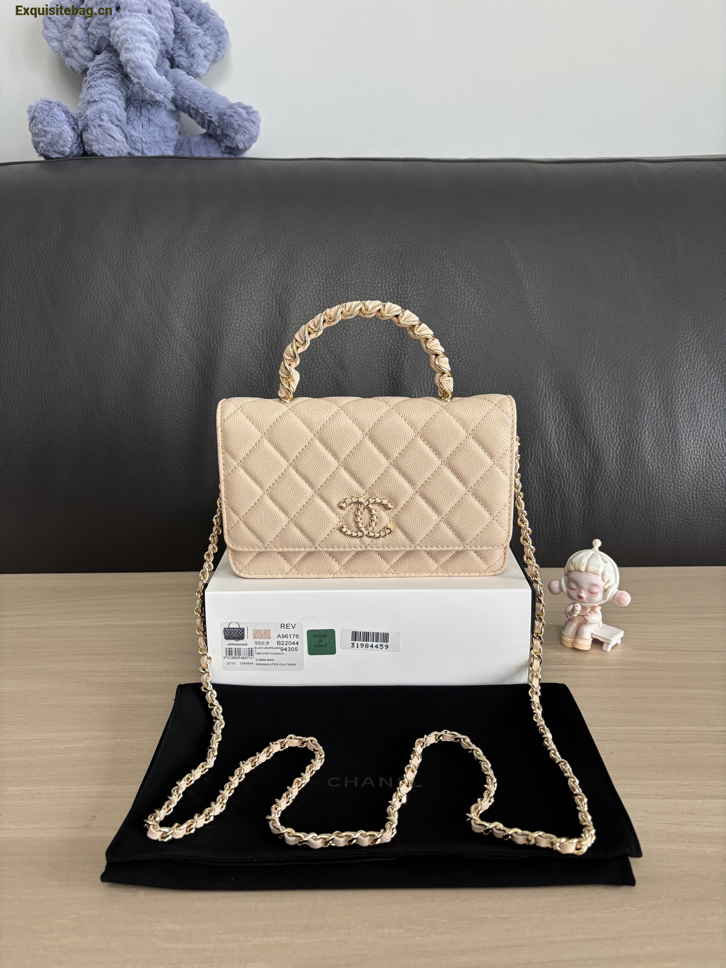 Chanel Shiny Caviar Quilted Strass CC Wallet On Chain WOC Beige