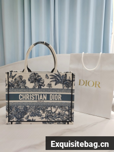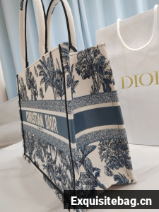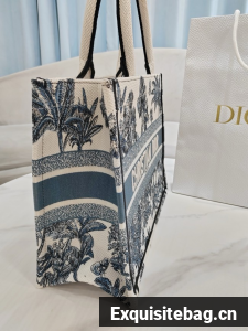 :: Medium Dior Book Tote White and Blue Toile de Jouy Palms Embroidery M1296ZEYD