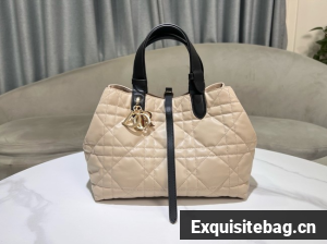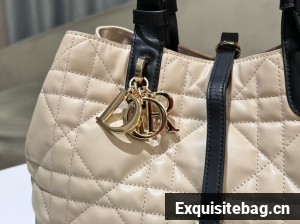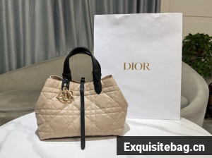 The Dior Toujours bag is distinguished by a casual and practical design. Crafted in rope beige calfskin with Macrocannage topstitching and black calfskin detailing, it showcases a spacious interior compartment with a matching pouch to organize the essentials. Its thin leather strap closure keeps items secure while the D of the CD Lock clasp twists to adjust the sides and enhance the bag"s silhouette. Equipped with leather top handles that can be adjusted using the small notches, the small bag can be effortlessly carried by hand.