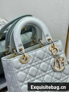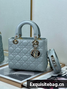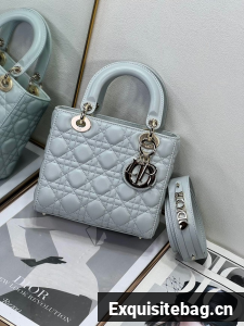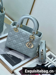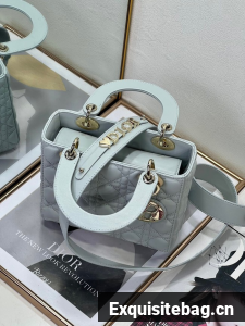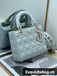 The Lady Dior My ABCDior bag epitomizes Dior"s vision of elegance and beauty. Sleek and refined, the timeless style is crafted in pale blue lambskin with Cannage stitching, creating the unmistakable quilted texture. Pale gold-finish metal D.I.O.R. charms offer elegant appeal. Featuring a strap that can be personalized with symbolic badges, the small, unique design may be carried by hand or worn crossbody.