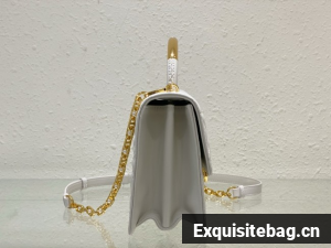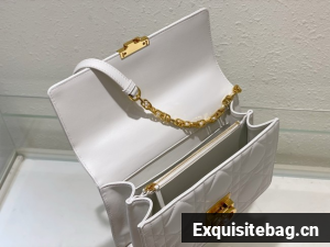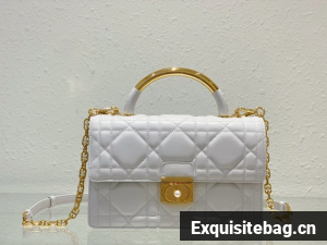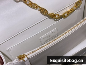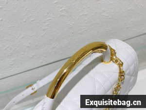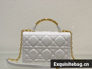 New for Fall 2024, the Dior Ange bag embodies the new House line with a resolutely modern and elegant aesthetic. Constructed in black calfskin with Macrocannage stitching, it is distinguished by its structured top handle in antique gold-finish metal engraved with the Christian Dior Paris signature and its flap with a CD clasp embellished with a resin pearl. The gusseted silhouette reveals two spacious compartments, a zip pocket and two slip pockets to hold all the essentials. Adorned with an adjustable and removable CD link chain in gold-finish metal accented by resin pearls, the medium refined bag can be carried by hand, worn over the shoulder or crossbody.
