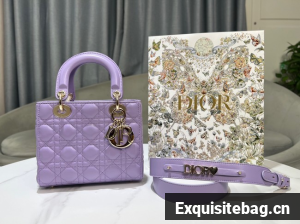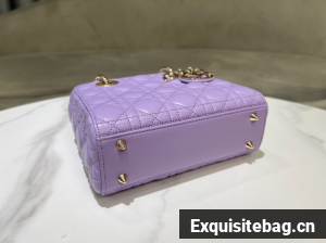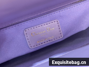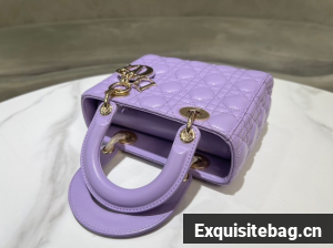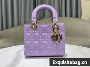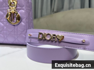 The Lady Dior My ABCDior bag epitomizes the House"s vision of elegance and beauty. Sleek and refined, the timeless style is crafted in lilac lambskin with Cannage stitching, creating the instantly recognizable quilted texture, while the pale gold-finish metal D.I.O.R. charms embellish and illuminate the silhouette. Featuring a shoulder strap that can be customized by adding badges, the small, unique style may be carried by hand or worn crossbody.