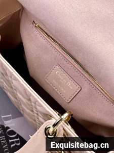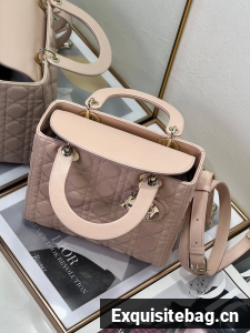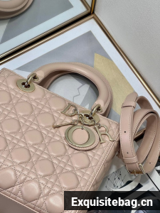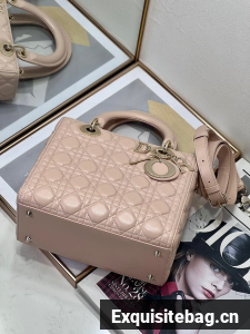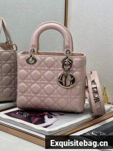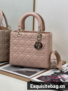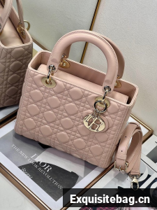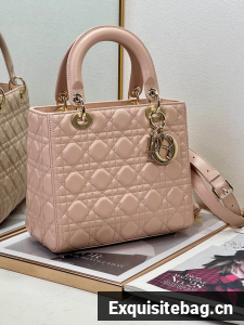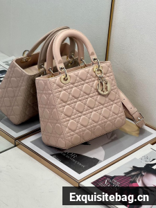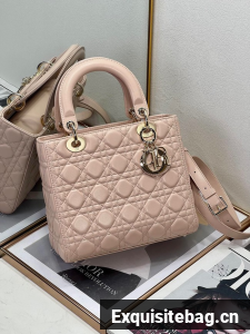 The Lady Dior bag epitomizes the House"s vision of elegance and beauty. Sleek and refined, the style is timeless. It is crafted in powder pink lambskin with Cannage stitching, creating the instantly recognizable quilted texture. Pale gold-finish metal D.I.O.R. charms lend elegant appeal. Featuring a thin, removable leather shoulder strap, the medium Lady Dior bag may be carried by hand or worn crossbody.