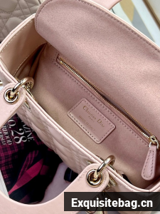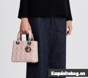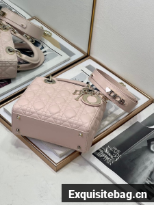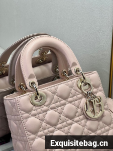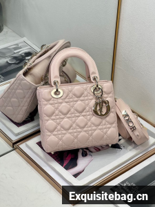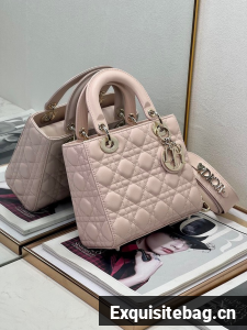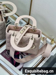 The Lady Dior My ABCDior bag epitomizes Dior"s vision of elegance and beauty. Sleek and refined, the timeless style is crafted in powder pink lambskin with Cannage stitching, creating the instantly recognizable quilted texture. Pale gold-finish metal D.I.O.R. charms further embellish its silhouette with an elegant touch. Featuring a shoulder strap that can be personalized with badges, the small, unique design may be carried by hand or worn crossbody.