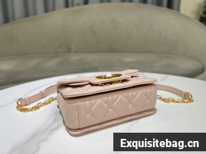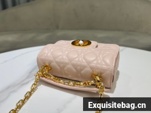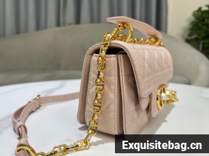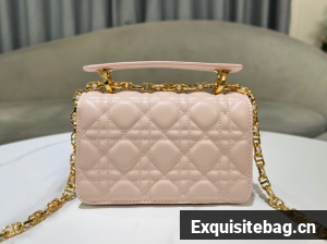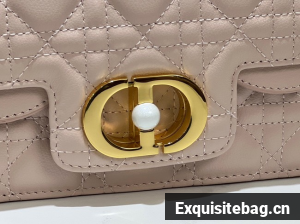 New for Summer 2024, the Dior Jolie Top Handle bag presents an elegant and functional design. It is crafted in powder pink calfskin with Cannage stitching and features a flap enhanced by a CD signature embellished with a white resin pearl, as well as two compartments and a zip pocket to accommodate all the essentials, day or evening. The removable top handle is completed by a detachable chain strap with a leather insert and CD signature links embellished with white resin pearls, allowing the miniature bag to be comfortably carried by hand, worn over the shoulder or crossbody.