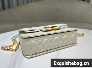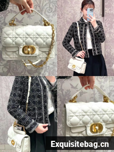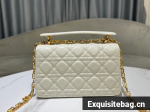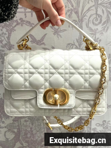 New for Summer 2024, the Dior Jolie Top Handle bag presents an elegant and functional design. It is crafted in latte calfskin with Cannage stitching and features a double flap enhanced by a CD signature embellished with a white resin pearl, as well as three compartments and a zip pocket to accommodate all the essentials, day or evening. The removable top handle is completed by a detachable chain strap with a leather insert and CD signature links embellished with white resin pearls, allowing the small bag to be comfortably carried by hand, worn over the shoulder or crossbody.
