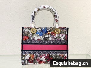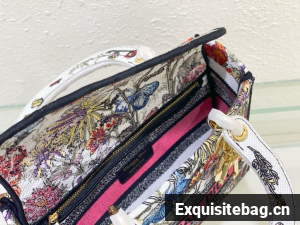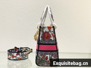The Lady D-Lite bag combines classic elegance with House modernity. The style is fully embroidered with a white multicolor Mexico Millefiori motif by Pietro Ruffo, showcasing butterflies and Mexican flowers in an elegant and colorful spirit. A Christian Dior Paris signature adorns the front, while D.I.O.R. charms in pale gold-finish metal further enhance and highlight the silhouette. Featuring a wide, removable embroidered shoulder strap, the medium Lady D-Lite bag can be carried by hand or worn crossbody.