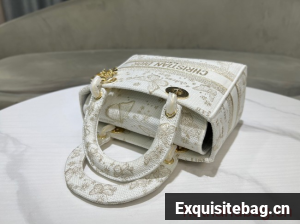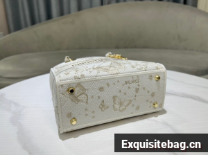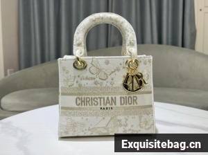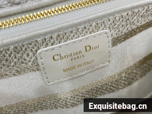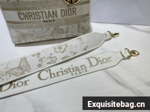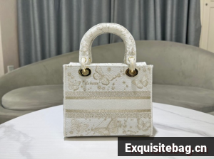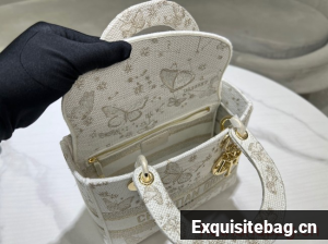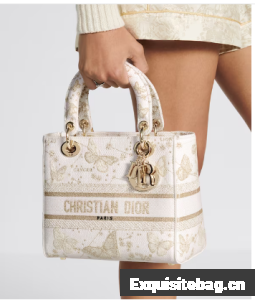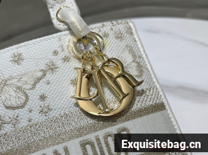 The Lady D-Lite bag combines classic elegance with House modernity. The style is fully embroidered with a gold-tone and white Butterfly Zodiac motif by Pietro Ruffo, showcasing a constellation enhanced by astrological signs and adorned with butterflies. A Christian Dior Paris signature adorns the front, while D.I.O.R. charms in pale gold-finish metal further enhance and highlight the silhouette. Featuring a wide, removable embroidered shoulder strap, the medium Lady D-Lite bag can be carried by hand or worn crossbody.