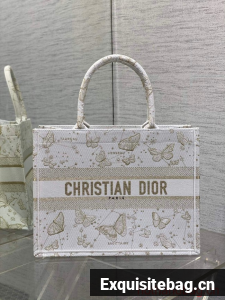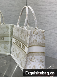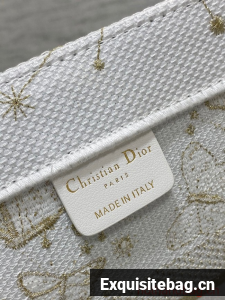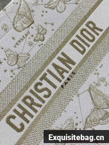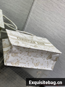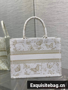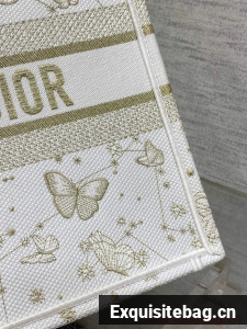 Introduced by Maria Grazia Chiuri, Creative Director of Christian Dior, the Dior Book Tote has become a staple of the Dior aesthetic. Designed to hold all the daily essentials, the style is fully embroidered with a white and gold-tone Butterfly Zodiac motif by Pietro Ruffo, showcasing a constellation enhanced by astrological signs and adorned with butterflies. Adorned with the Christian Dior Paris signature on the front, the medium tote exemplifies the House"s signature savoir-faire and may be carried by hand or worn over the shoulder.