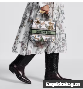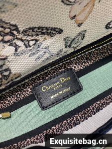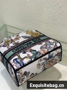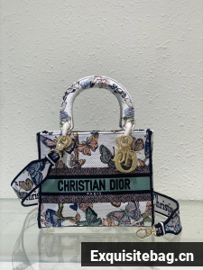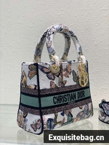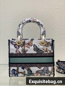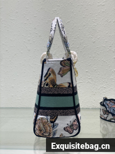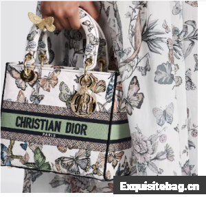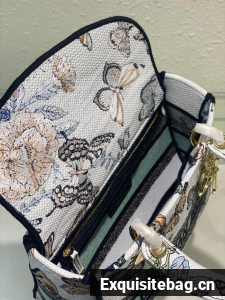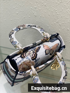 The Lady D-Lite bag combines classic elegance with House modernity. The style is fully embroidered with a white multicolor Toile de Jouy Mexico motif by Pietro Ruffo, showcasing butterflies and traditional Mexican flowers in a concert of colors. A Christian Dior Paris signature adorns the front, while D.I.O.R. charms in pale gold-finish metal enhance and highlight the silhouette. Featuring a wide, removable embroidered shoulder strap, the medium Lady D-Lite bag can be carried by hand or worn crossbody.