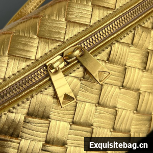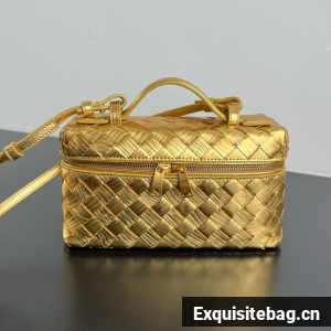 • Intrecciato wood-embossed lamina leather vanity case with detachable strap• One main compartment, one flat pocket• Zipped closure• Lining: Lambskin• Color: Gold• Hardware: Gold finish• Made in: Italy• Product code: 789109V5XQ08472ChatGPT said: • Height: 12.5 cm (4.9") • Width: 22 cm (8.7") • Depth: 5 cm (2") • Handle drop: 4.5 cm (1.8") • Strap drop: 55 cm (21.7")Replica Bottega Veneta Comes with dust bag, authentication cards, and pamphlets.