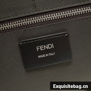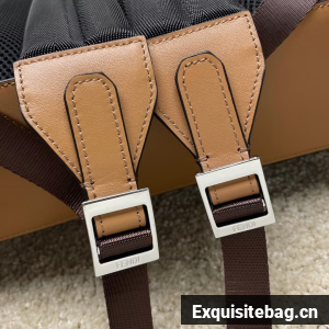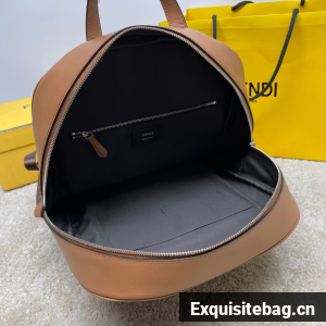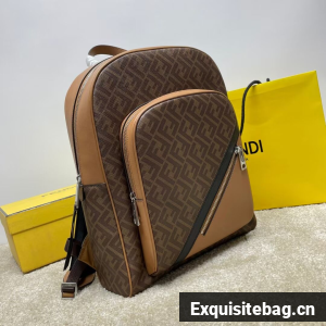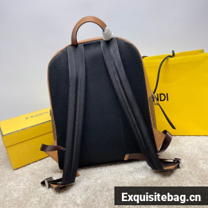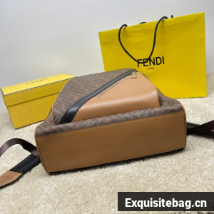 Spacious, structured backpack. The design features a metal rivet with an engraved FF logo that joins the shoulder straps and allows it to be worn as a one-shoulder style. Made of brown FF canvas with beige leather details. Finished with a black leather diagonal insert on the front zipper pocket.