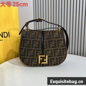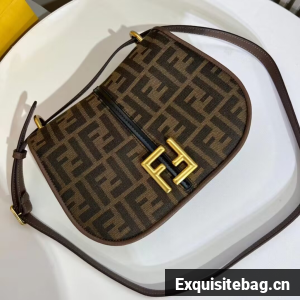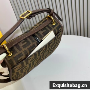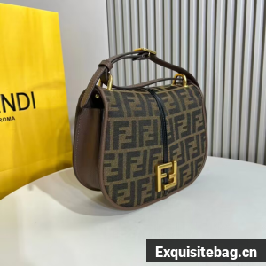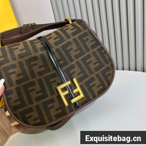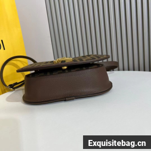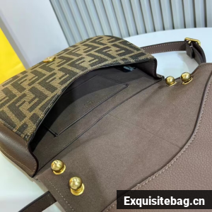 Medium satchel bag with curved, feminine lines, elongated flap and back made of fabric with an FF jacquard motif. The sides and the embossed accents are made of smooth dark brown leather.
