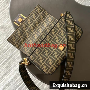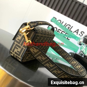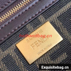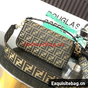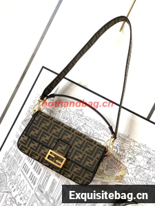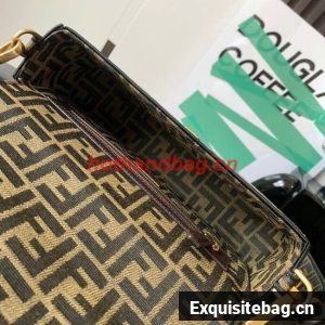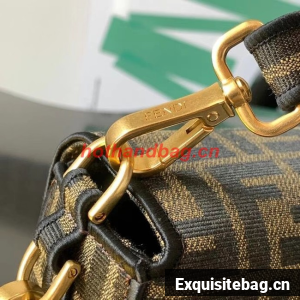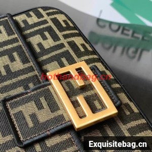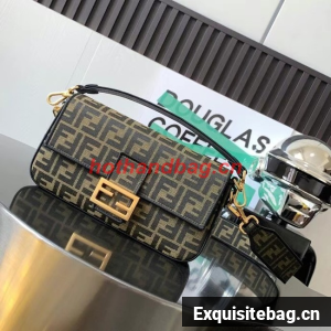 Iconic medium Baguette bag made of brown jacquard fabric with an FF motif, decorated with an FF clasp and trimmed with black embroidery.