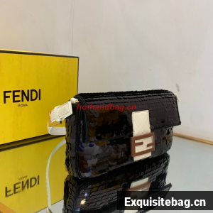 :: Fendi FF Baguette Gold Metal Sequin Embroidery Bag 2017 Black