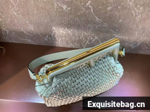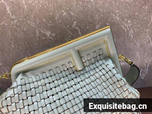 Fendi First bag made of finely braided mint green leather, with oversized metal F clasp bound in tone on tone nappa leather.