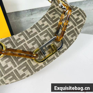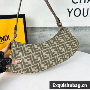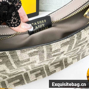 Pouch made of chenille with dove gray FF tapestry motif and zipper closure, decorated with Fendi Roma lettering in gold-colored metal.