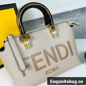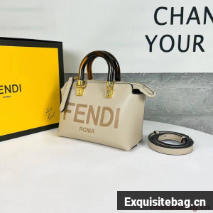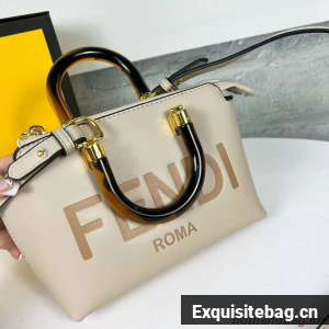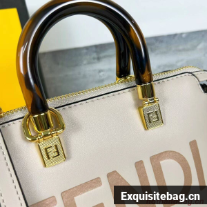 Iconic mini By The Way Boston bag made of leather with hot-stamped FENDI ROMA lettering and rigid tortoiseshell-effect plexiglass handles. Zip fastening.