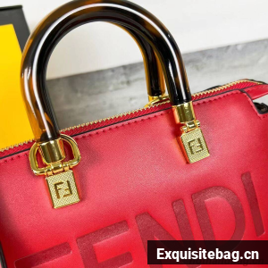 Iconic mini By The Way Boston bag made of leather with hot-stamped FENDI ROMA lettering and rigid tortoiseshell-effect plexiglass handles. Zip fastening.