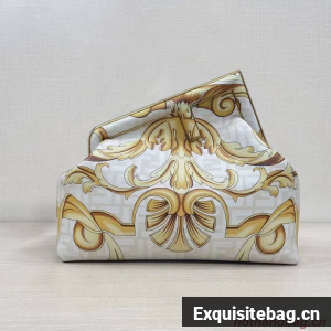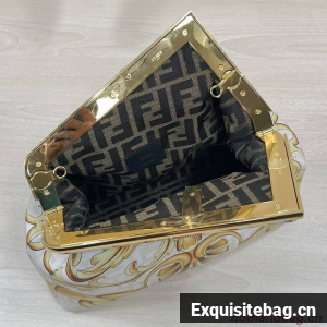 Medium Fendi First bag made of white silk with Versace by Fendi print. Born of the creative collaboration between the two fashion houses, the graphics combine the iconic Fendi FF logo with the Versace gold Baroque print. Oversized metal F clasp bound in tone on tone silk.