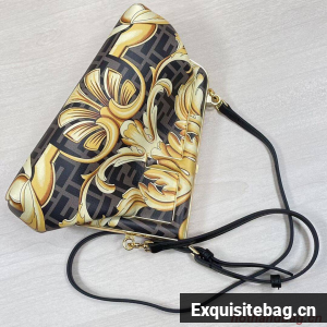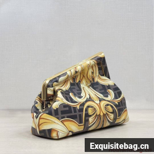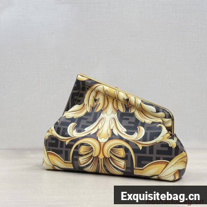 Small Fendi First bag made of silk with Versace by Fendi print. Born of the creative collaboration between the two fashion houses, the graphics combine the iconic Fendi FF logo with the Versace gold Baroque print. Oversized metal F clasp bound in tone on tone silk.