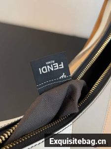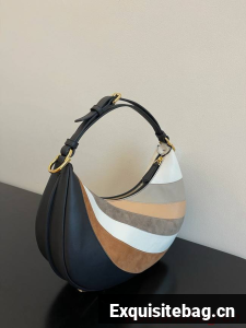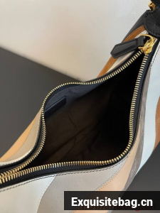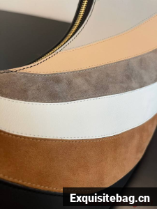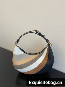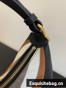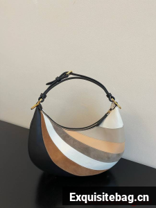 Small Hobo bag produced by inlaying leather, laminated leather and suede by hand to a rainbow diagonal striped motif in shades of beige and brown. With vintage gold metal FENDI lettering visible when the bag is worn under the arm.