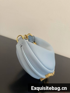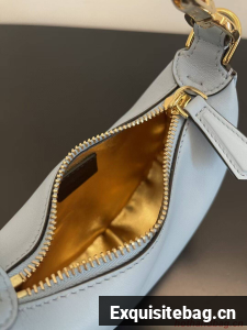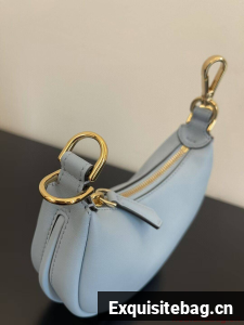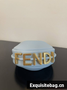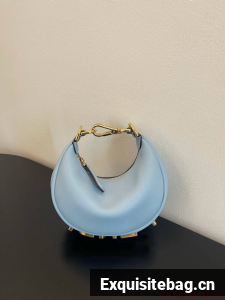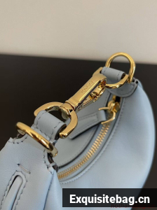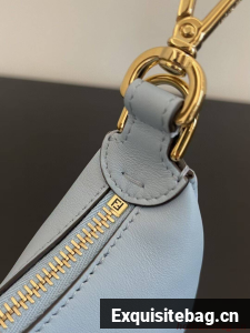 Nano Fendigraphy Hobo bag with zip fastening, embellished with vintage gold metal FENDI lettering. The adjustable strap with a clip allows it to be attached to larger bags or worn on the wrist. Comes with hooks for the shoulder strap. Made of light blue leather. Gold-finish metalware.
