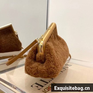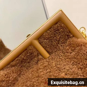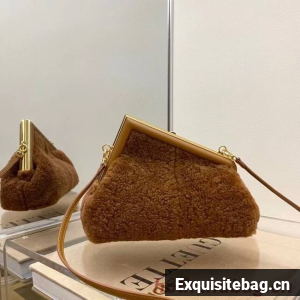 Small Fendi First bag made of soft, pale brown merino sheepskin with oversized metal F clasp bound in tone on tone nappa leather.