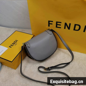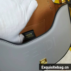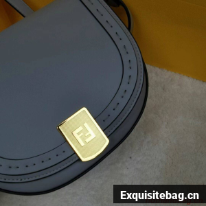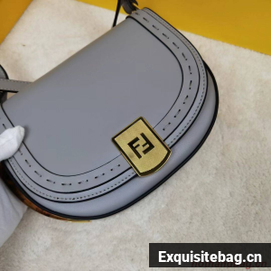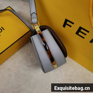 Hand-stitched grey leather satchel featuring a metallic closure with the iconic FF motif and hot-pressed Fendi Roma logo under the flap. With a lined, internal compartment, small inner pocket, tortoiseshell-effect plexiglass details and gold-finish metalware.