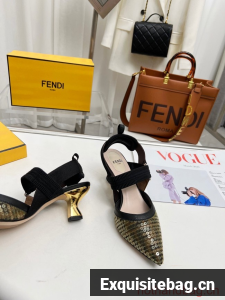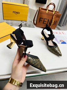 Colibrì slingbacks with pointed toe and elastic ribbons that wrap around the foot. The sole is embellished with rubber inserts. Made of micro mesh with an FF motif. Finished with amber-colored sequin embroidery. The padded cushion and hiking shoe tab add a sporty touch. Gold-enameled heel.